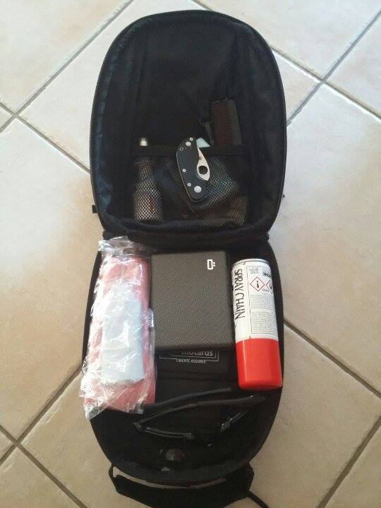 A l’avant, si j’ai le gros Bagster (comme sur la photo) je n’ouvre pas le soufflet, pour ne pas être dérangée par la hauteur (je l’ai fait une fois sur un FZ6…. irk…). J’y met mes papiers, mes cartes papiers, mon chargeur, de l’eau, mes médocs, une paire de lunettes de soleil, une petite laine et mes affaires de pluie. Bref, tout ce qui doit être rapidement accessible. Si j’emmène du « fragile » comme de la nourriture ou une bouteille, idem, tout sur l’avant !